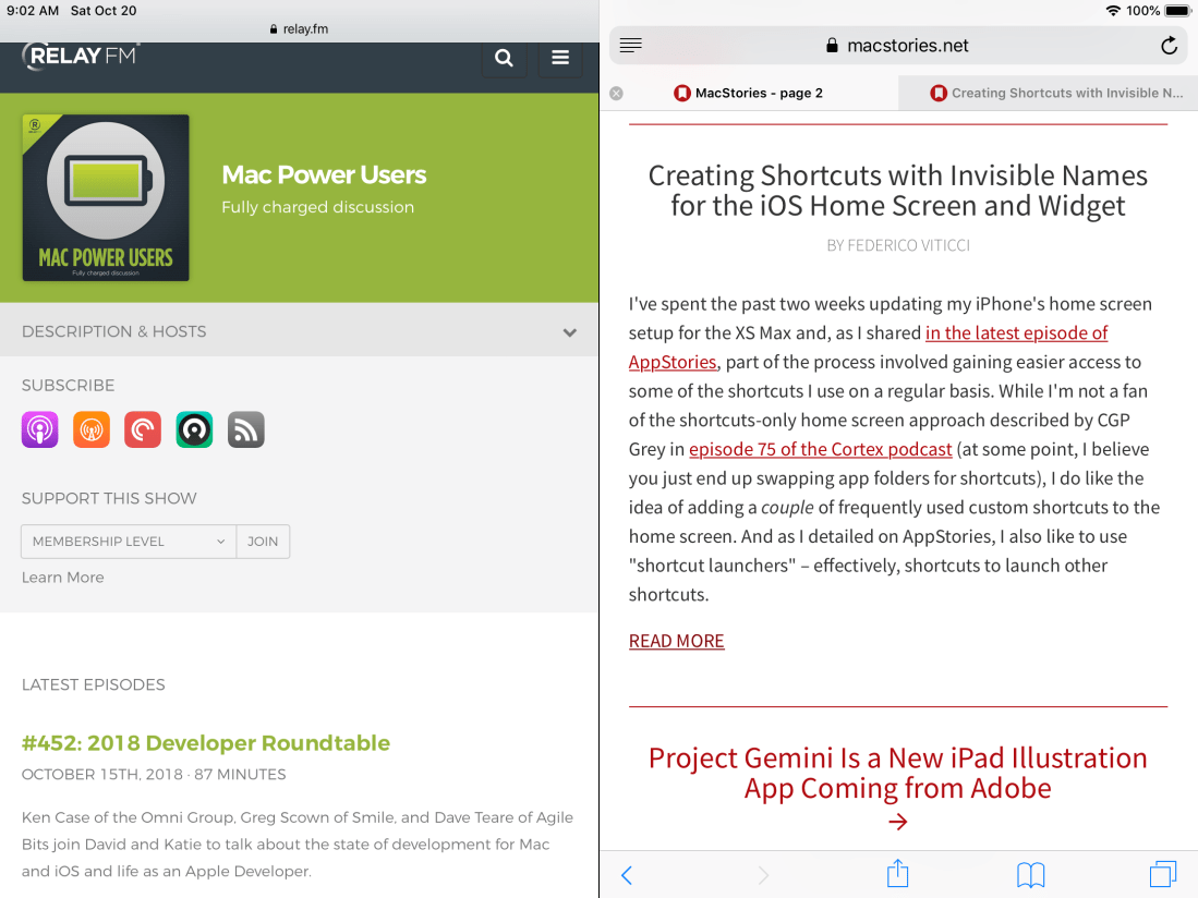 Ok, now to Issa’s question on a split view handling of two PDFs. One built-in app that can natively support split view is Safari. You could split the screen to view two different websites by tapping and holding the header of one tab and dragging it to the top right/left corner of the screen. You could then even have multiple tabs on each side of the screen.