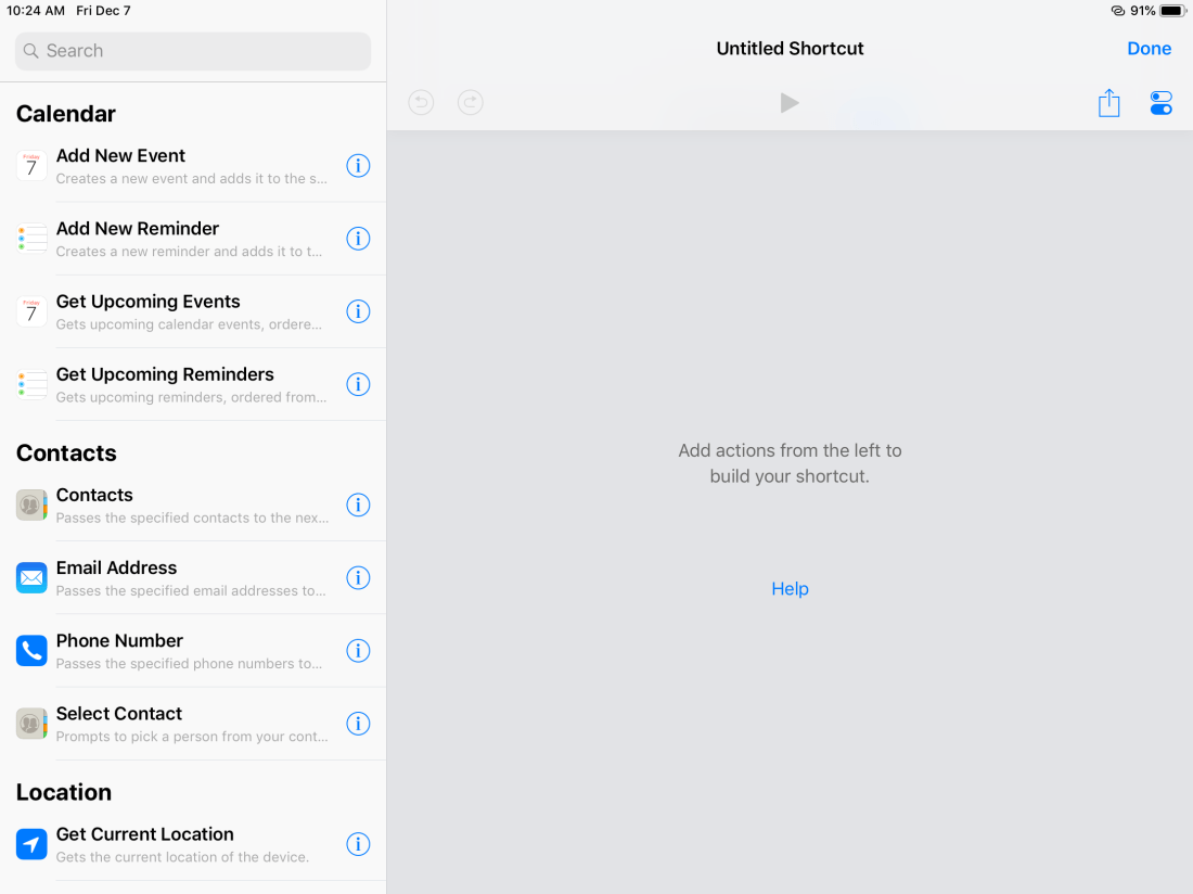 This will take you to the below screen, where you’ll see some suggestions for actions to add to the shortcut. You may grab an item and drag it to the right column of the screen.