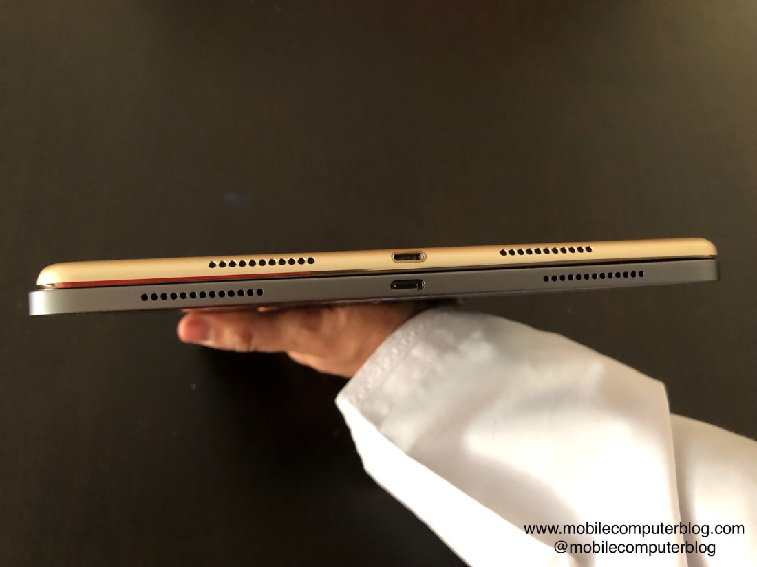 The screen size is a bit larger, but is very similar to the 10.5″. The device is a bit shorter, thinner, and lighter, but is a bit wider than the 10.5″. You could see here that the floating third app on the 11″ model is a bit wider than that on the 10.5″ model.