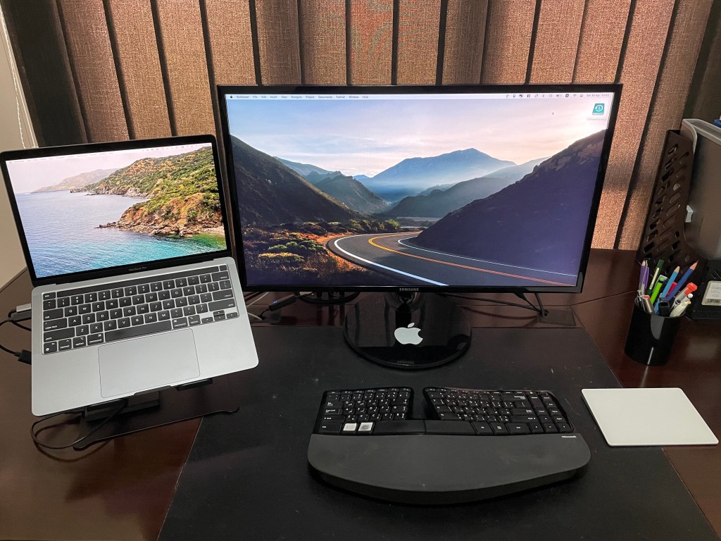 The MacBook Pro would not only serve as a mobile computer, but also as a desktop computer for when I’m at my home office. To properly serve this role, I would need to hook it to my 27” Samsung monitor, use the MacBook screen (raised with a stand from Pillarmax) as a secondary monitor, and use it with my Magic Trackpad and MS Ergonomic Keyboard.